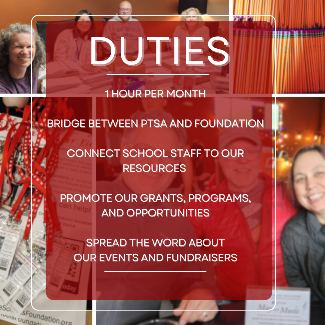 | Call for Ambassadors Be a voice for the Foundation! The Foundation is looking for Ambassadors who believe in the power of our mission! No experience necessary, just passion for our Northshore students and schools. Complete our Ambassador application and we’ll get back to you. AMBASSADOR APPLICATION | ![]() ![]() |