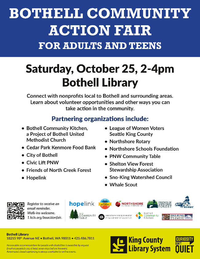 Bothell Community Action Fair The Foundation will attend the fair and inform folks about our volunteer opportunities, including Board Member positions. Save the date: Saturday, Oct. 25th Location: Bothell Public Library: 18215 98th Avenue NEBothell WA 98011 Time: 2:00pm – 4:00pm COMMUNITY ACTION FAIR DETAILS |
